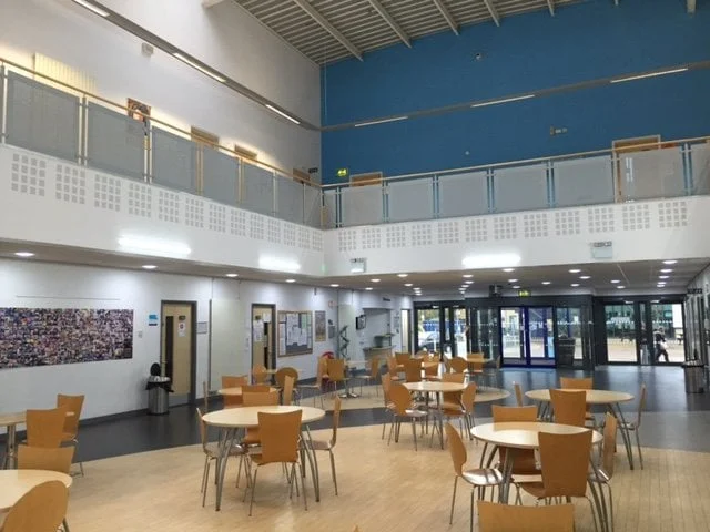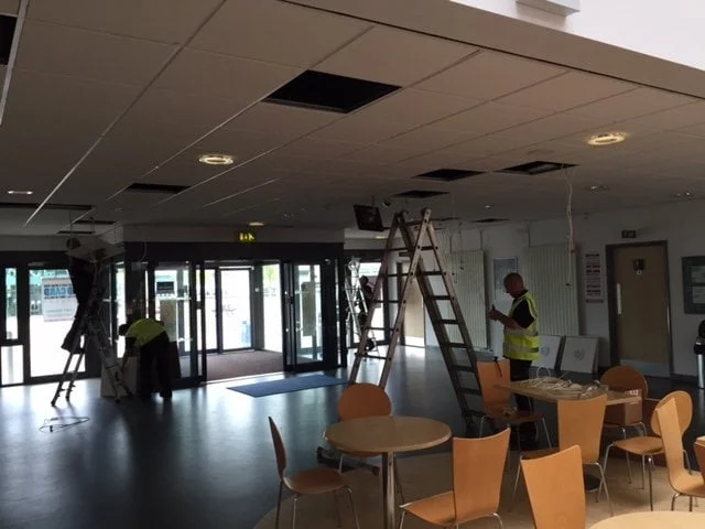 SRC1: We installed more than 200 new LED luminaires, including mood lighting, across four floors both internally and externally. This covered classrooms, kitchens, offices, café areas, and toilets. The project required working at heights of up to 14m, making use of lift gear and scaffold equipment to ensure safe and precise installation.