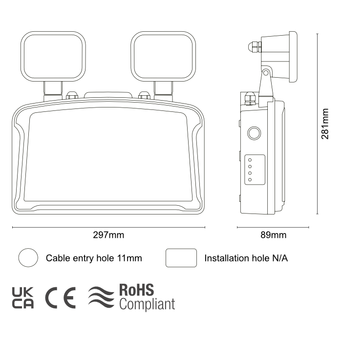 The 2.5W Twin Spot Emergency Light is a reliable and energy-efficient solution for maintaining safety and visibility during mains power failure. Designed with two adjustable LED heads, it delivers focused illumination where it is needed most, making it ideal for warehouses, corridors, stairwells, etc. With a combined low power consumption of just 2.5 watts, this fitting ensures reduced running costs without compromising on brightness or performance.