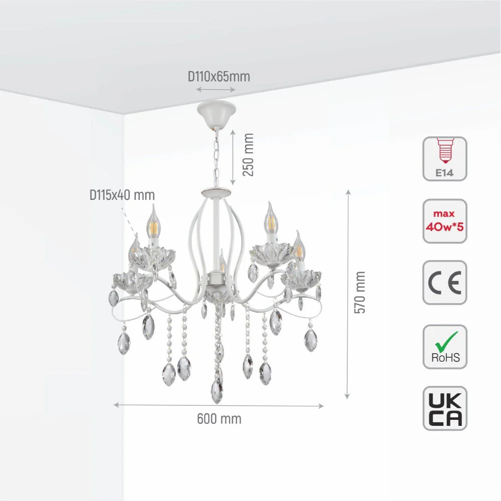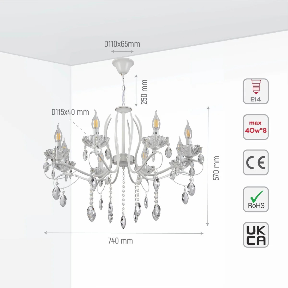 Designed to accommodate E14 candle bulbs, the Château Crystal Chandelier is available in both 5 and 8 lamp configurations, offering versatility for different room sizes and lighting requirements. The chandelier operates on a standard 220–240V supply and is hardwired for a clean, professional finish. With an IP20 rating, it is ideal for indoor use in dry environments.