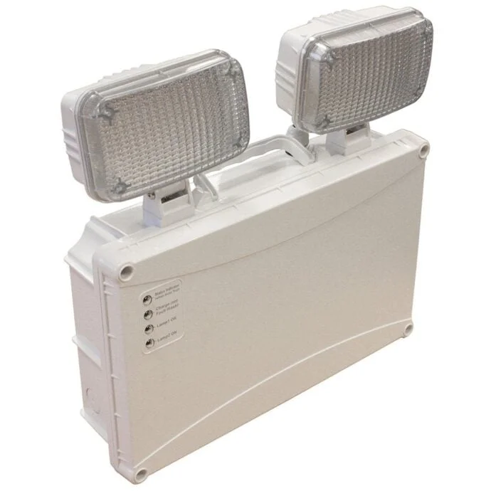 IP65 3 hours non maintained twin spot 2 x 1.5W. Suitable for corridors and general industrial use can be mounted in any orientation. 3 hours operation on battery power after mains failure, with self-test function to BS5266. ABS body and polycarbonate heads, including the lens.