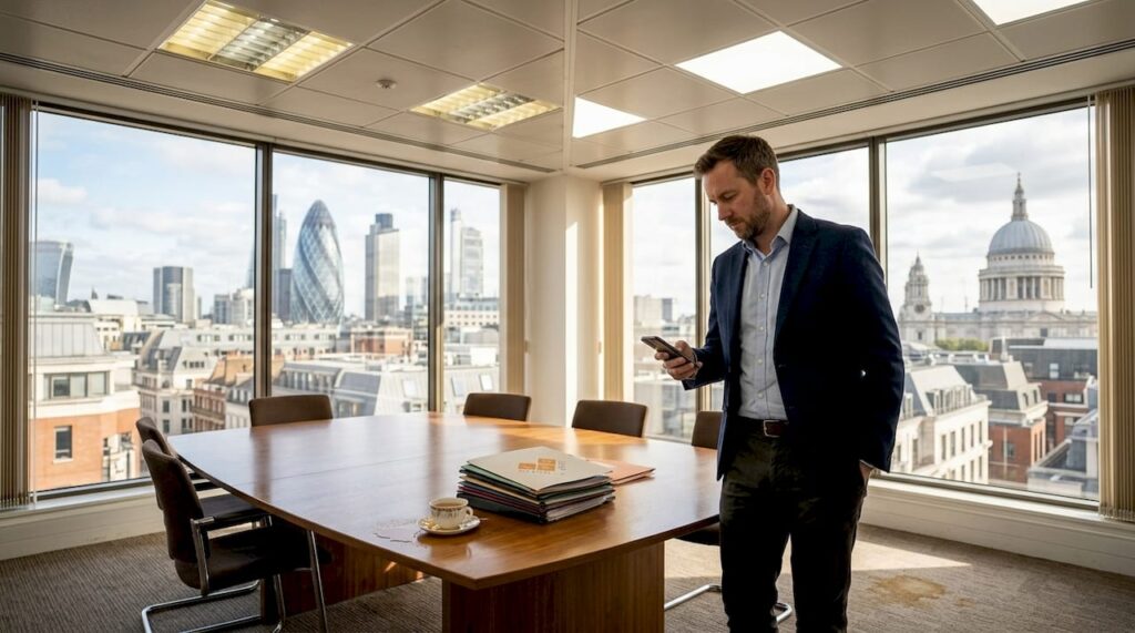 Office manager reviews lighting costs in UK office